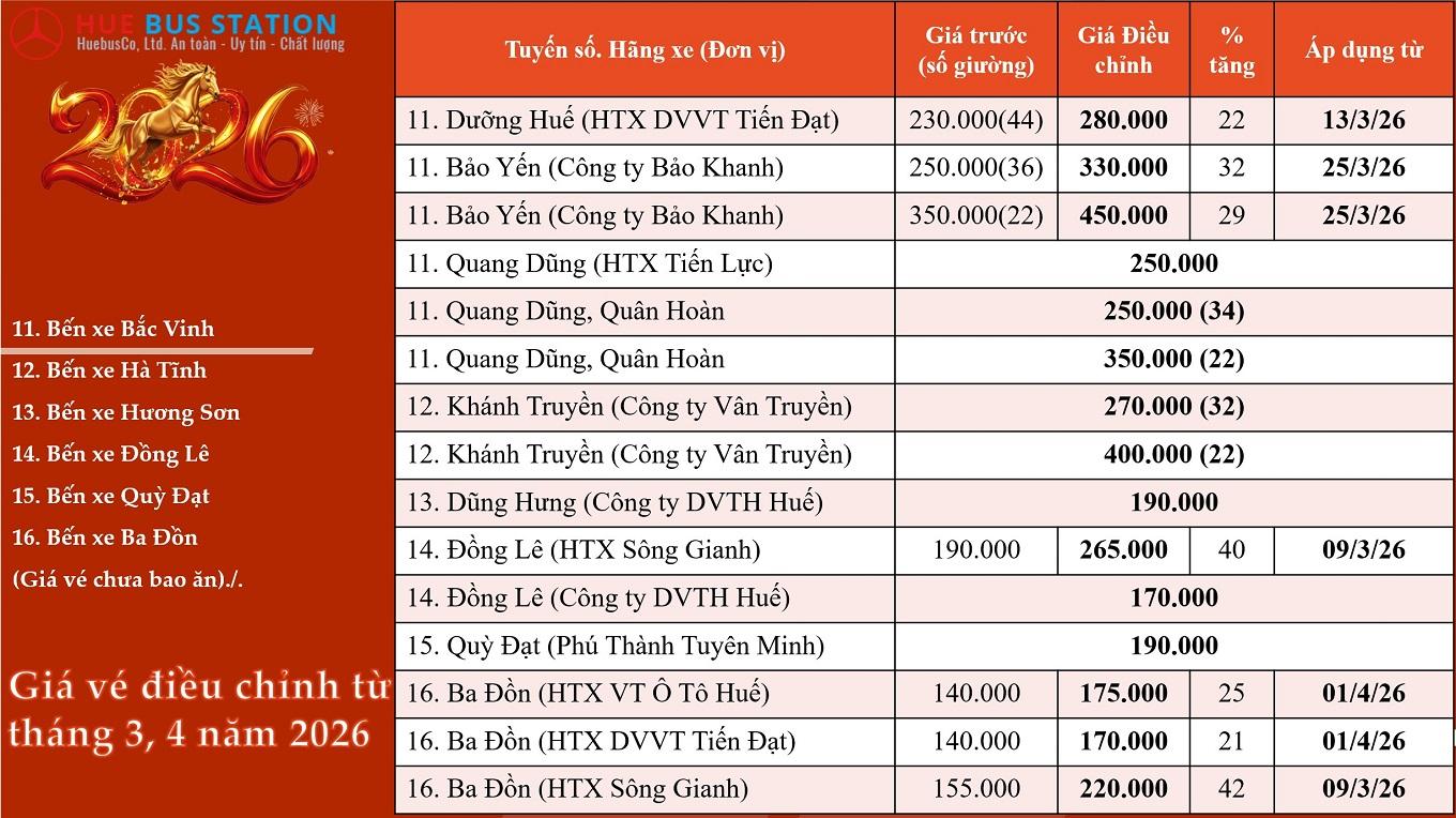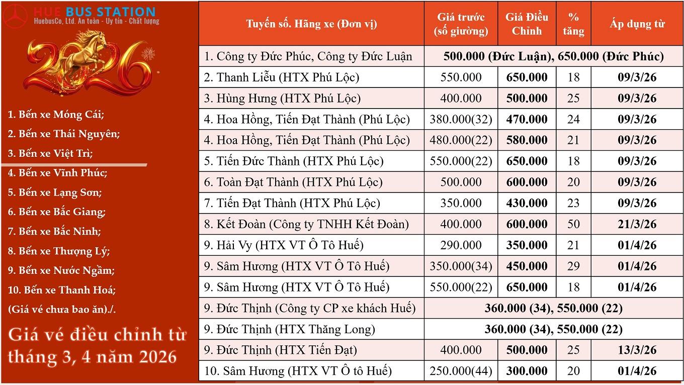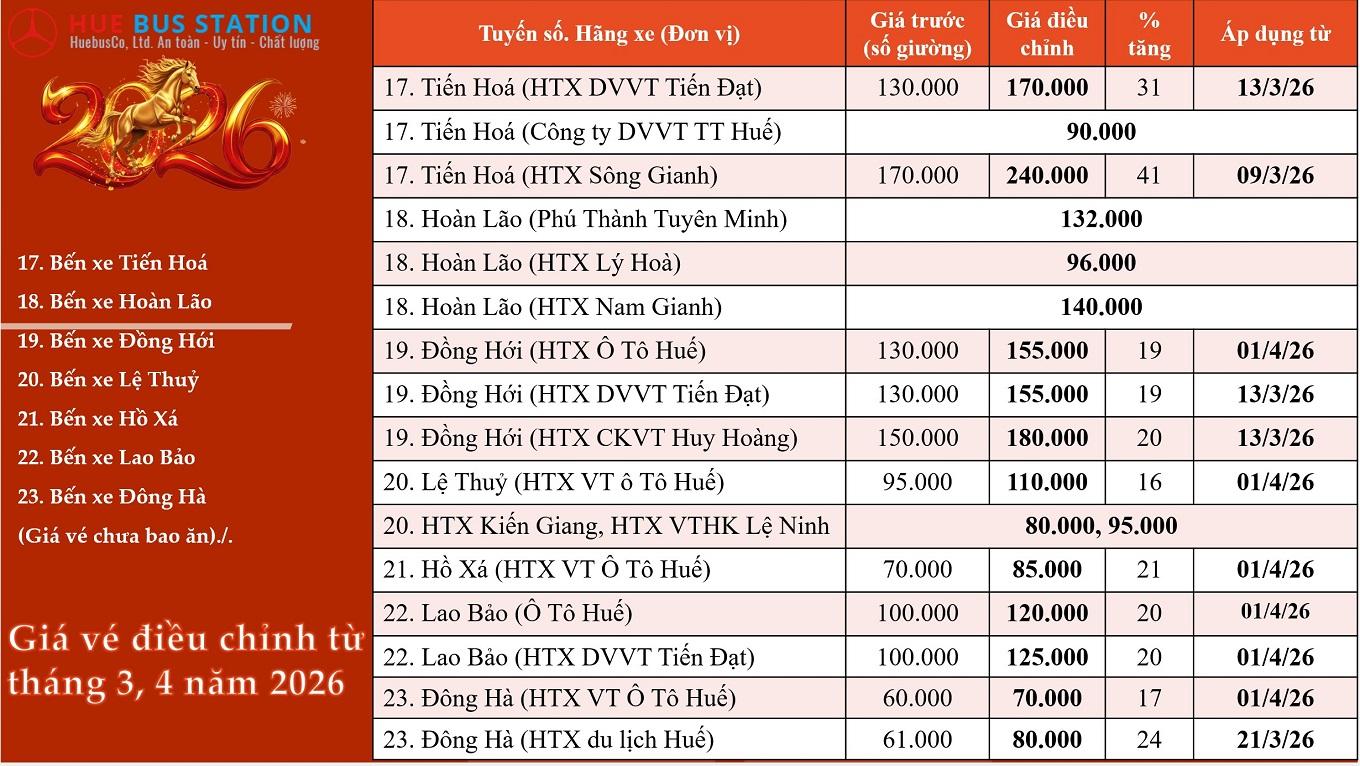 Nhằm giúp quý hành khách chủ động trong việc lên kế hoạch đi lại, Chi nhánh Bến xe phía Bắc - Công ty CP Bến xe Huế xin tổng hợp thông tin chi tiết về việc điều chỉnh giá vé do biến động giá nhiên liệu từ các đơn vị vận tải đang khai thác (cập nhật đến ngày 15/4/2026).