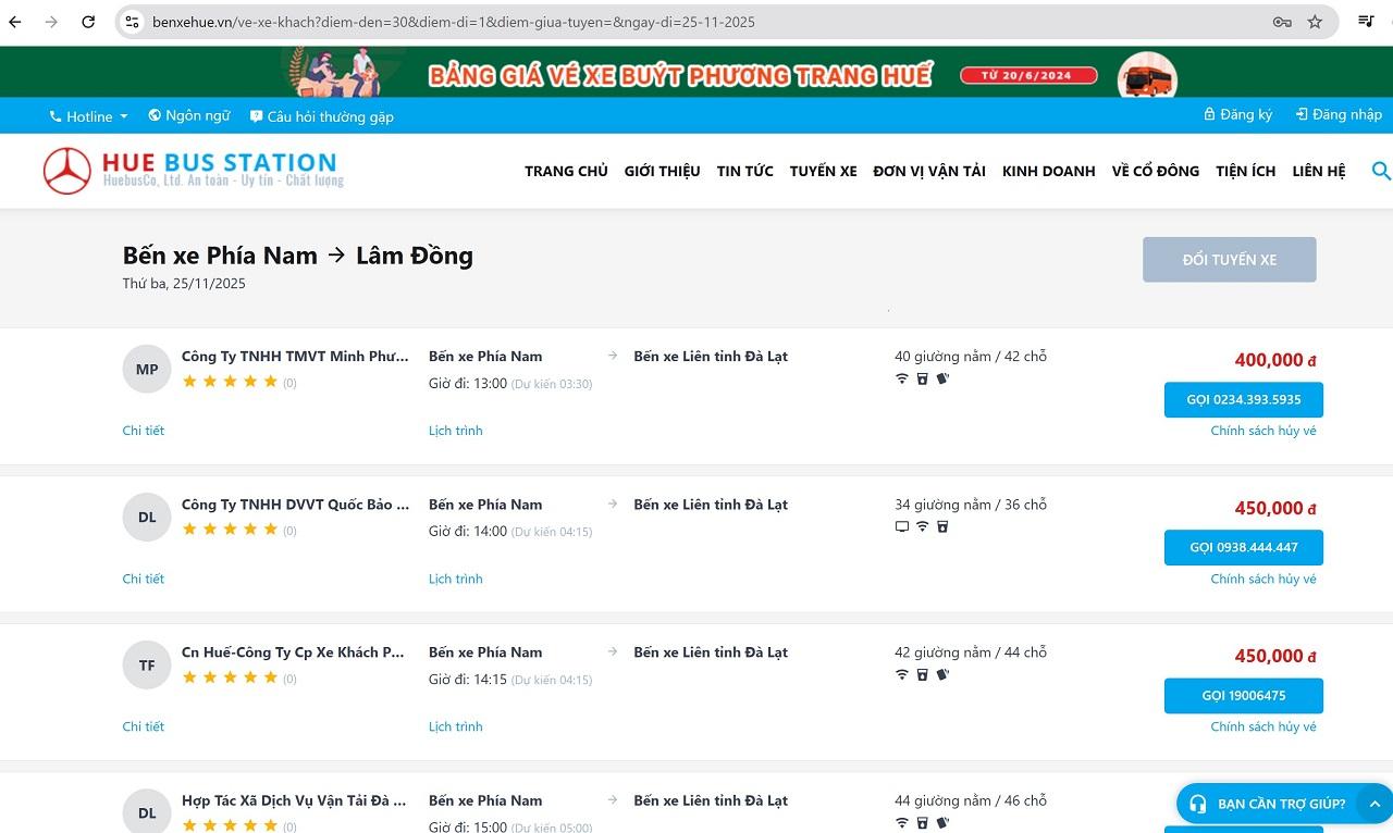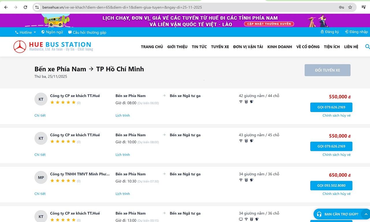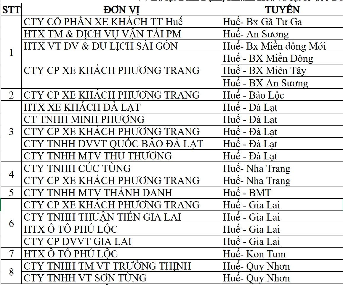 Các nhà xe đã nối lại lịch trình, bố trí phương tiện phục vụ hành khách theo đúng giờ, đồng thời thực hiện kiểm tra kỹ thuật nhằm bảo đảm an toàn trong quá trình khai thác sau thời gian tạm ngưng hoạt động. Các đơn vị vận tải cũng tiếp tục theo dõi hiện trạng những vị trí từng bị sạt lở để kịp thời điều chỉnh phương án đường đi thay thế tạm thời khi cần thiết. Danh sách các tuyến cố định và đơn vị vận doanh bị ảnh hưởng do lũ lụt, sạt lỡ đất ghi nhận được tại Chi nhánh Bến xe phía Nam Tp Huế, gồm: