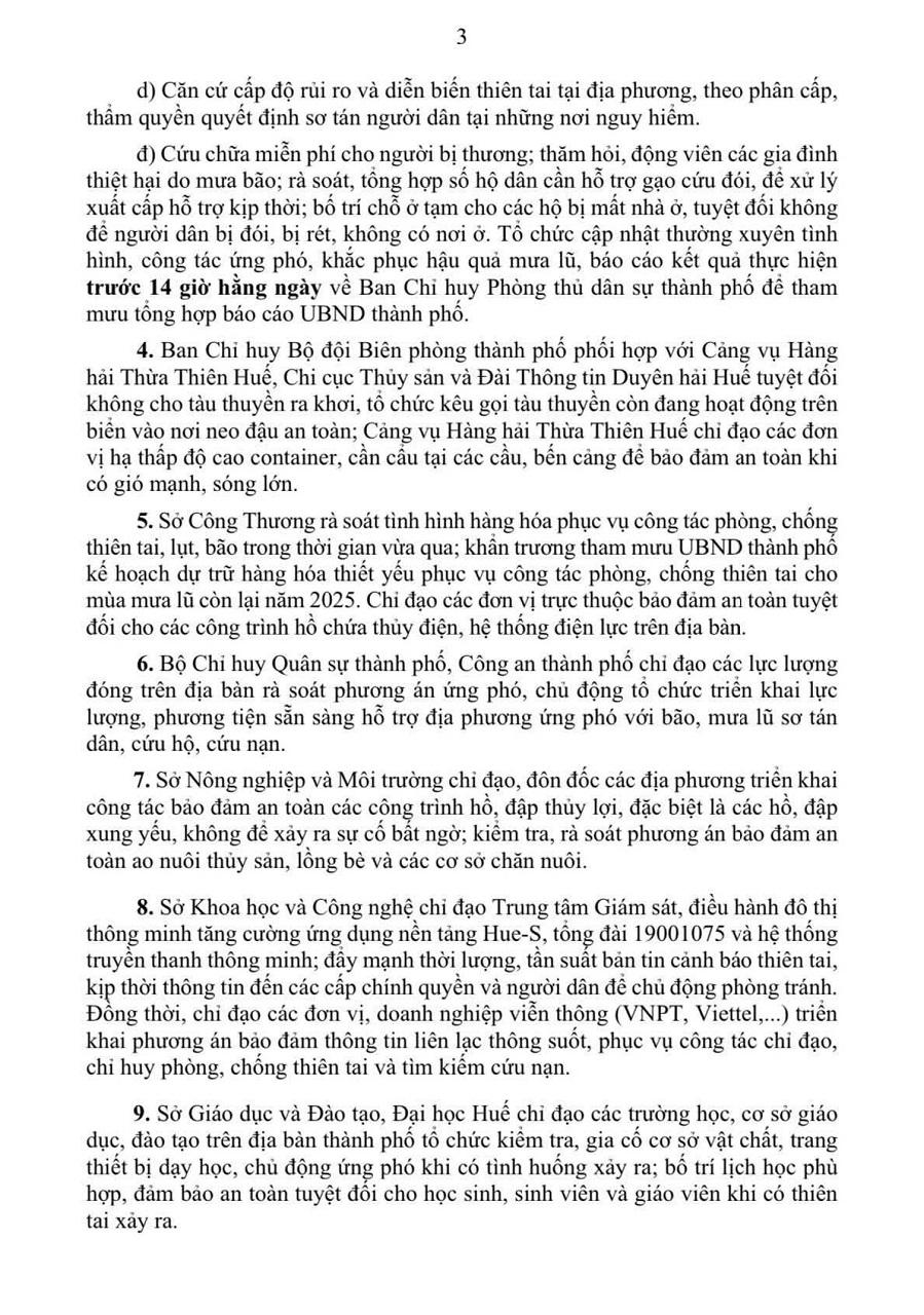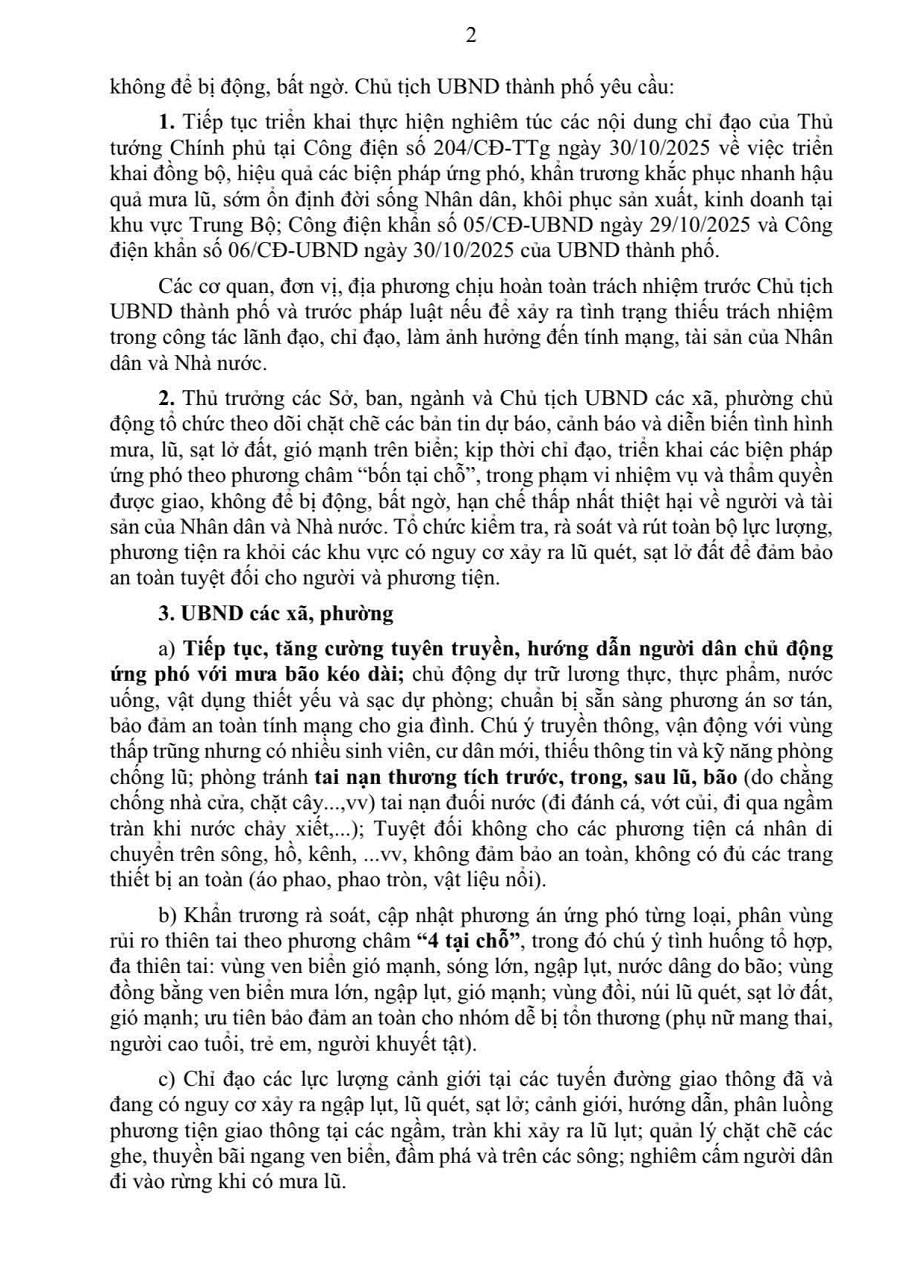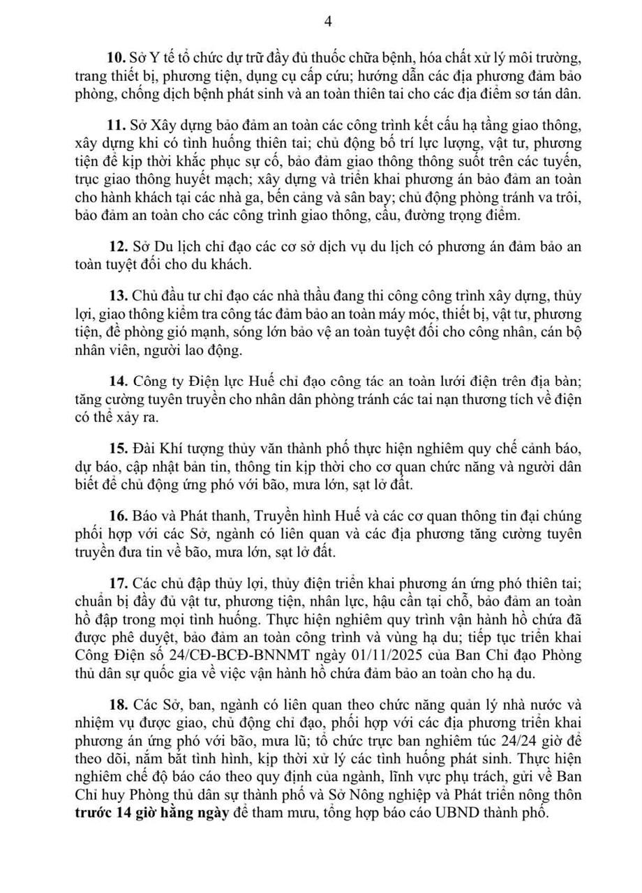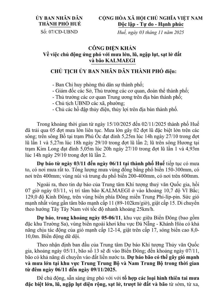 Thực hiện nghiêm chỉ đạo khẩn tại công điện số 07/CĐ-UBND ngày 03/11/2025 của Chủ tịch UBND Thành phố Huế, Ban quản lý các Chi nhánh Bến xe, Văn phòng Công ty trực thuộc Công ty CP Bến xe Huế cần tăng cường công tác kiểm tra, rà soát toàn bộ khu vực bến, văn phòng kịp thời củng cố các hạng mục có nguy cơ mất an toàn, bảo đảm hệ thống thoát nước thông suốt, khu vực đậu xe được sắp xếp gọn gàng, hạn chế tối đa thiệt hại khi mưa bão xảy ra trong thời gian sắp đến. Đồng thời, lực lượng trực ban và bảo vệ cần được bố trí ứng trực 24/24, sẵn sàng phối hợp với các đơn vị chức năng khi có tình huống khẩn cấp. Nội dung chi tiết công điện khẩn: