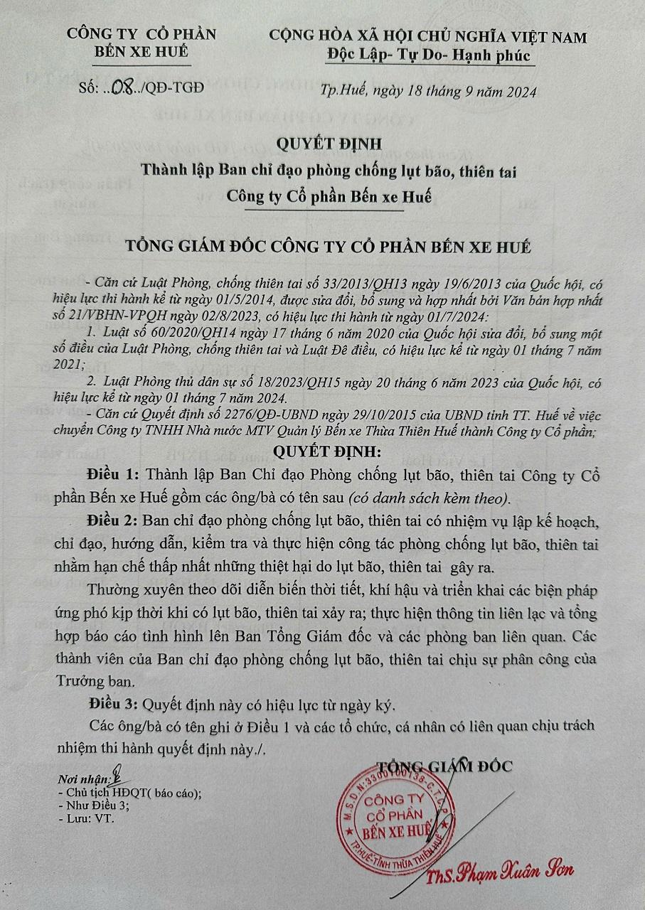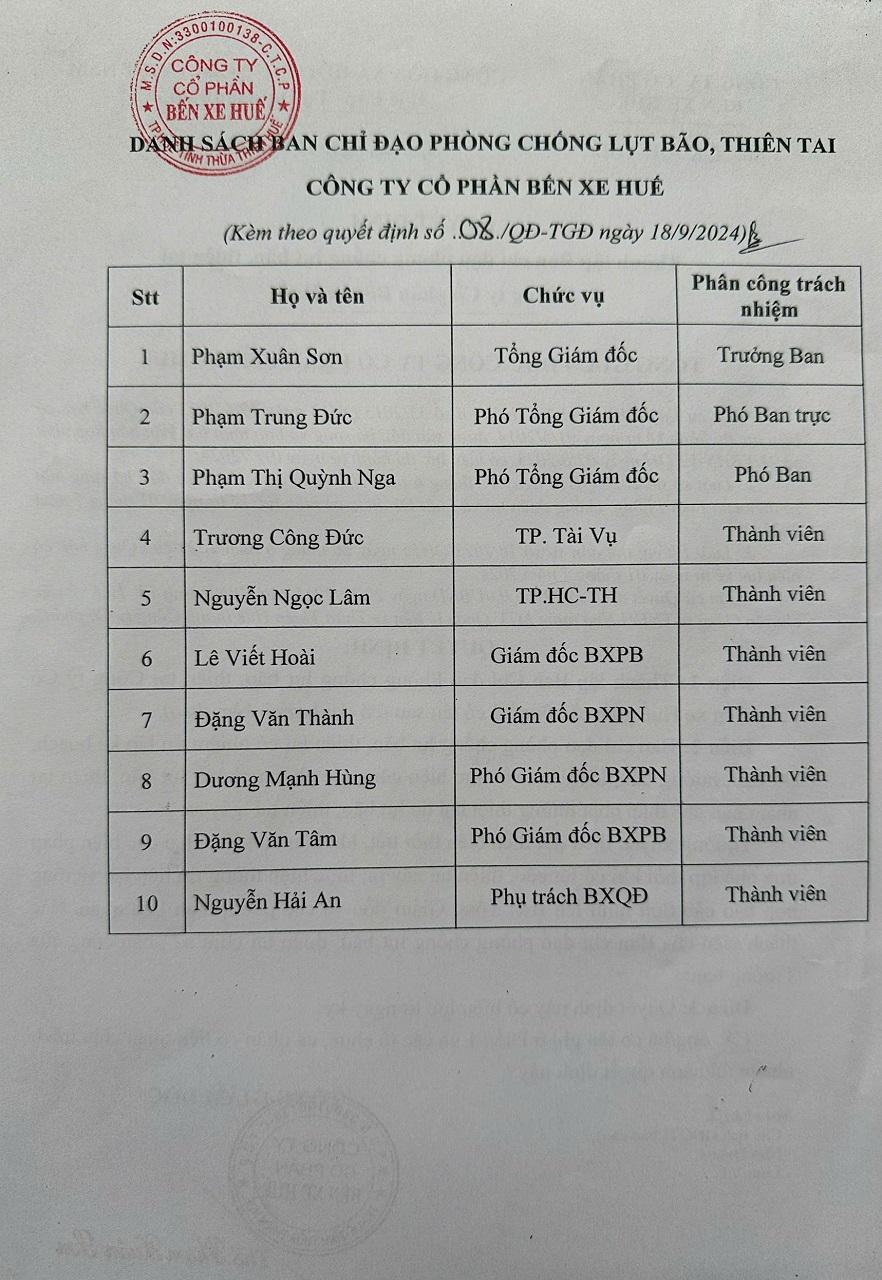 Ban chỉ đạo phòng chống lụt bão, thiên tai tại Công ty CP Bến xe Huế cần sớm lập kế hoạch chỉ đạo cụ thể, hướng dẫn, kiểm tra và thực hiện công tác phòng chống lụt bão, thiên tai, đồng thời chuẩn bị đầy đủ các phương án ứng phó sau bão, trong đó tập trung khắc phục nhanh các sự cố, vệ sinh môi trường, đảm bảo hoạt động vận tải trở lại bình thường trong thời gian sớm nhất. Phương án phòng chống bão lụt và cứu nạn cứu hộ được Tổng Giám đốc Công ty CP Bến xe Huế ban hành chi tiết số 05/PA-BX ngày 20/8/2025 trước đó, có thể tham khảo thực hiện tại link.