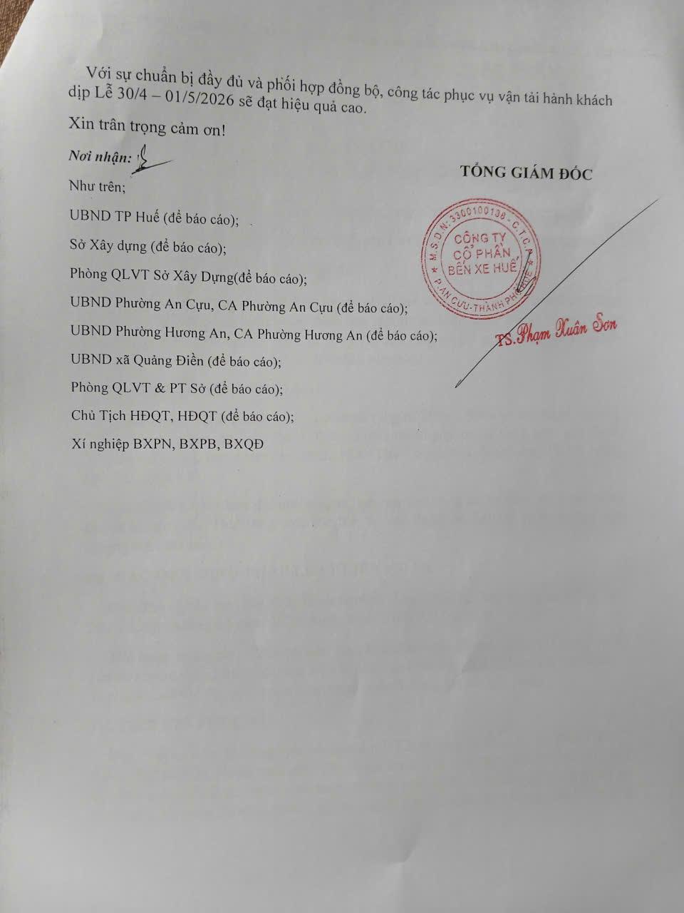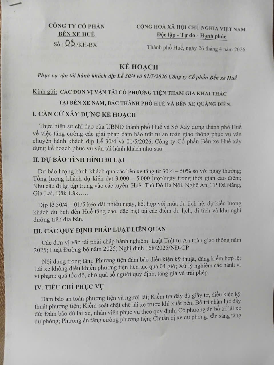 Công ty Cổ phần Bến xe Huế kêu gọi các đơn vị vận tải phối hợp chặt chẽ, thực hiện nghiêm các quy định nhằm đảm bảo phục vụ hành khách an toàn – thuận tiện – văn minh trong suốt thời gian lễ 30/4 – 01/5/2026. Trân trọng xin được thông báo./.