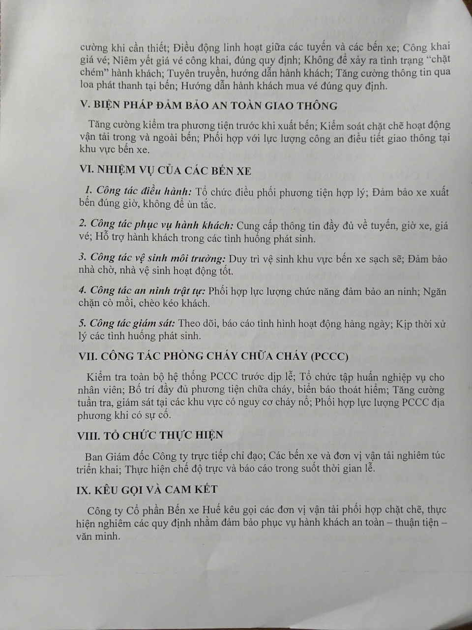 Thực hiện chỉ đạo của UBND thành phố Huế và Sở Xây dựng thành phố Huế, Công ty CP Bến xe Huế đã xây dựng kế hoạch toàn diện nhằm tăng cường các giải pháp đảm bảo trật tự an toàn giao thông, phục vụ nhu cầu di chuyển của người dân trong kỳ nghỉ lễ kéo dài.
