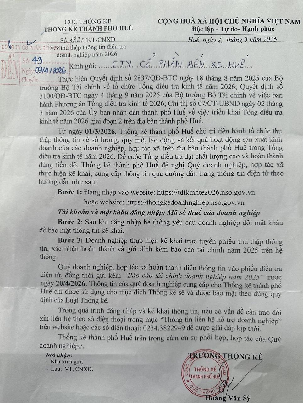 Thực hiện Quyết định số 2837/QĐ-BTC ngày 18/8/2025 và Quyết định số 3100/QĐ-BTC ngày 04/9/2025 của Bộ trưởng Bộ Tài chính về tổ chức Tổng điều tra kinh tế năm 2026; Chỉ thị số 07/CT-UBND ngày 02/3/2026 của UBND thành phố Huế về việc triển khai Tổng điều tra kinh tế năm 2026 giai đoạn 2 trên địa bàn. Căn cứ công văn số 132/TKT-CNXD của Cục Thống kê thành phố Huế về thu thập thông tin điều tra doanh nghiệp năm 2026 ngày 06/3/2026, Công ty Cổ phần Bến xe Huế đã nghiêm túc triển khai và hoàn thành đầy đủ các nội dung theo yêu cầu trước ngày 20/4/2026 theo quy định.