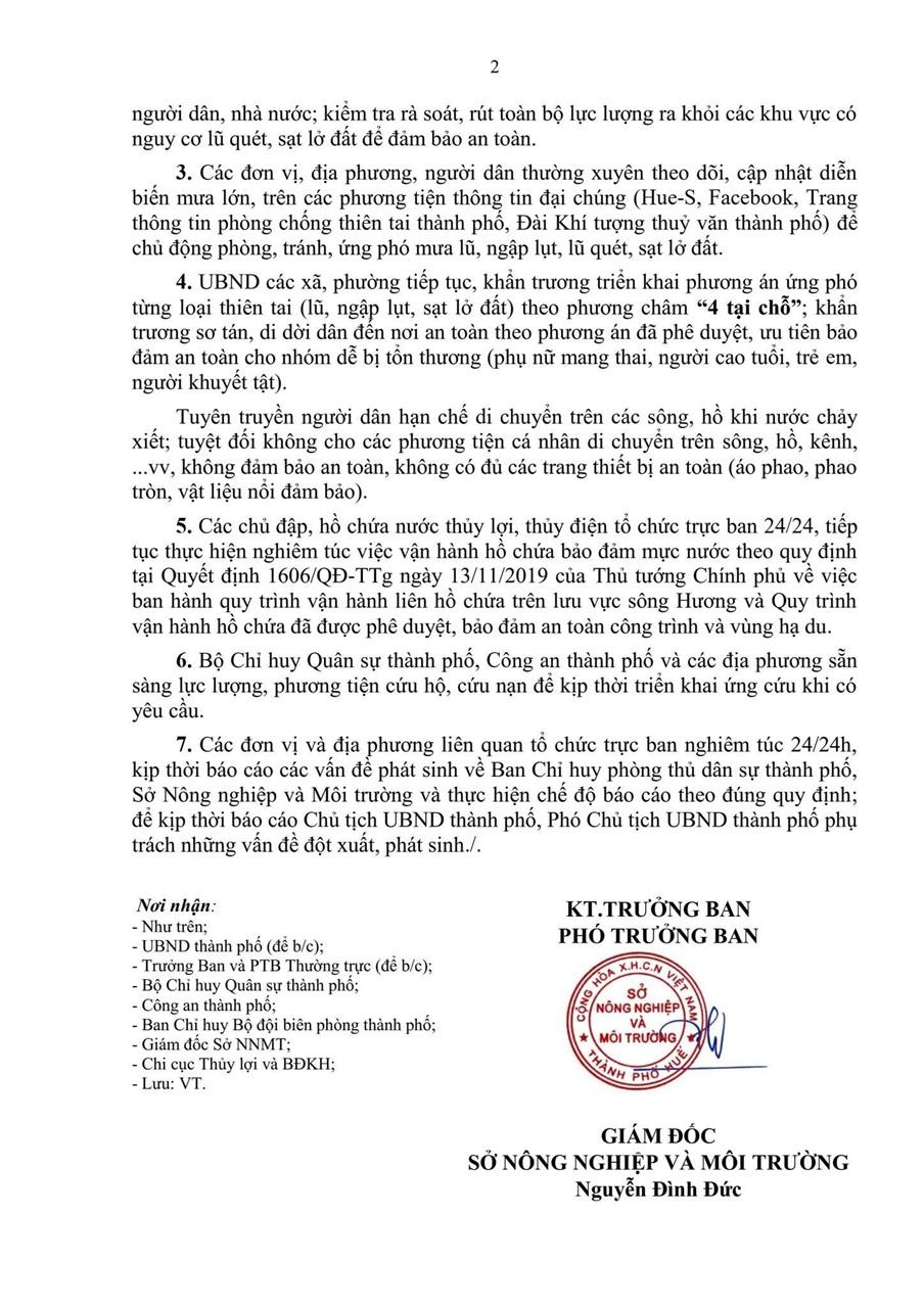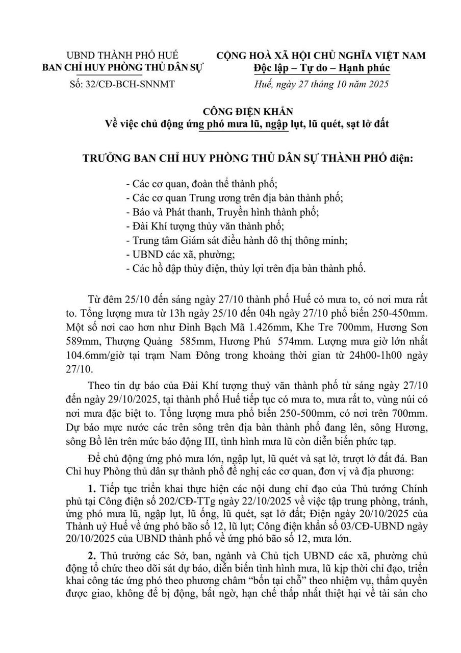 Trước diễn biến thời tiết phức tạp, mưa lớn kéo dài trên địa bàn thành phố Huế và các khu vực lân cận, Ban Chỉ huy Phòng thủ dân sự thành phố Huế đã ban hành Công điện khẩn số 32/CĐ-BCH-SNNMT ngày 27/10/2025 về việc chỉ đạo các cơ quan, đơn vị, địa phương khẩn trương triển khai phương án ứng phó, đảm bảo an toàn tính mạng và tài sản của nhân dân.