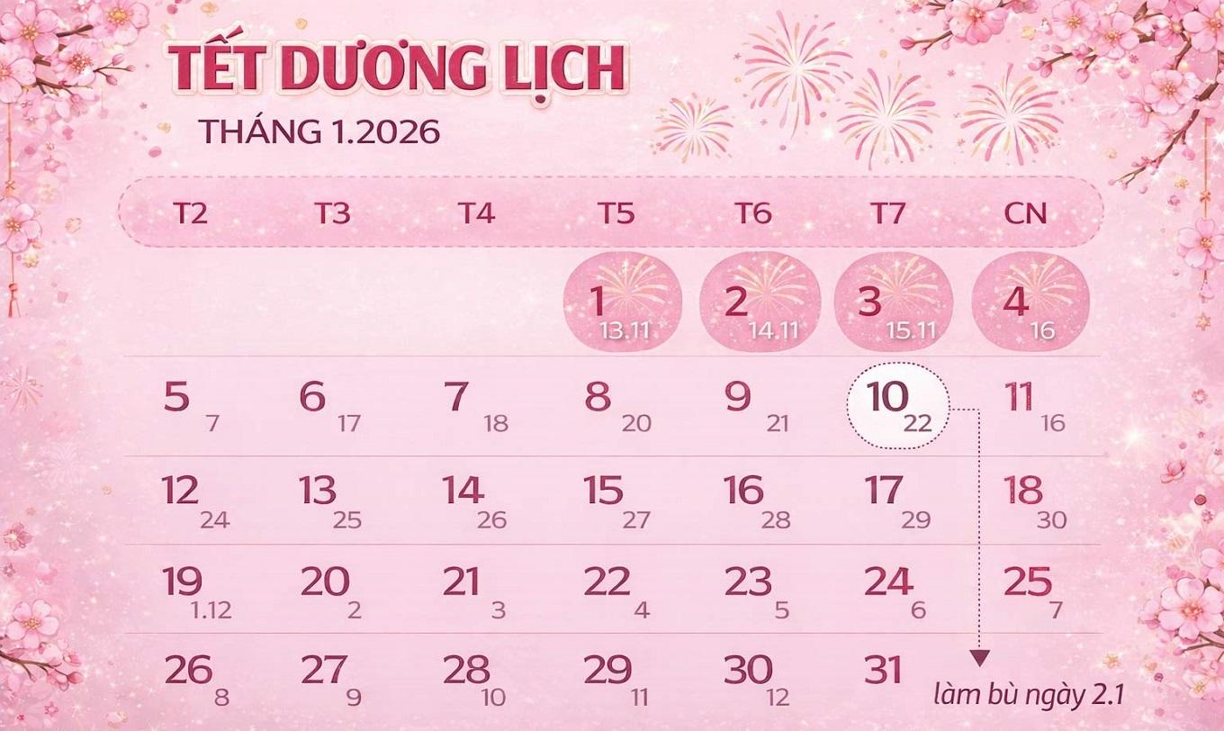 Theo đó, công chức và viên chức sẽ được nghỉ 04 ngày liên tục từ thứ Năm 01/01/2026 đến hết Chủ nhật 04/01/2026. Để có được kỳ nghỉ dài ngày này, cán bộ, công chức và viên chức sẽ nghỉ làm việc ngày thứ sáu 02/01/2026 và được hoán đổi sang làm bù vào thứ Bảy 10/01/2026.