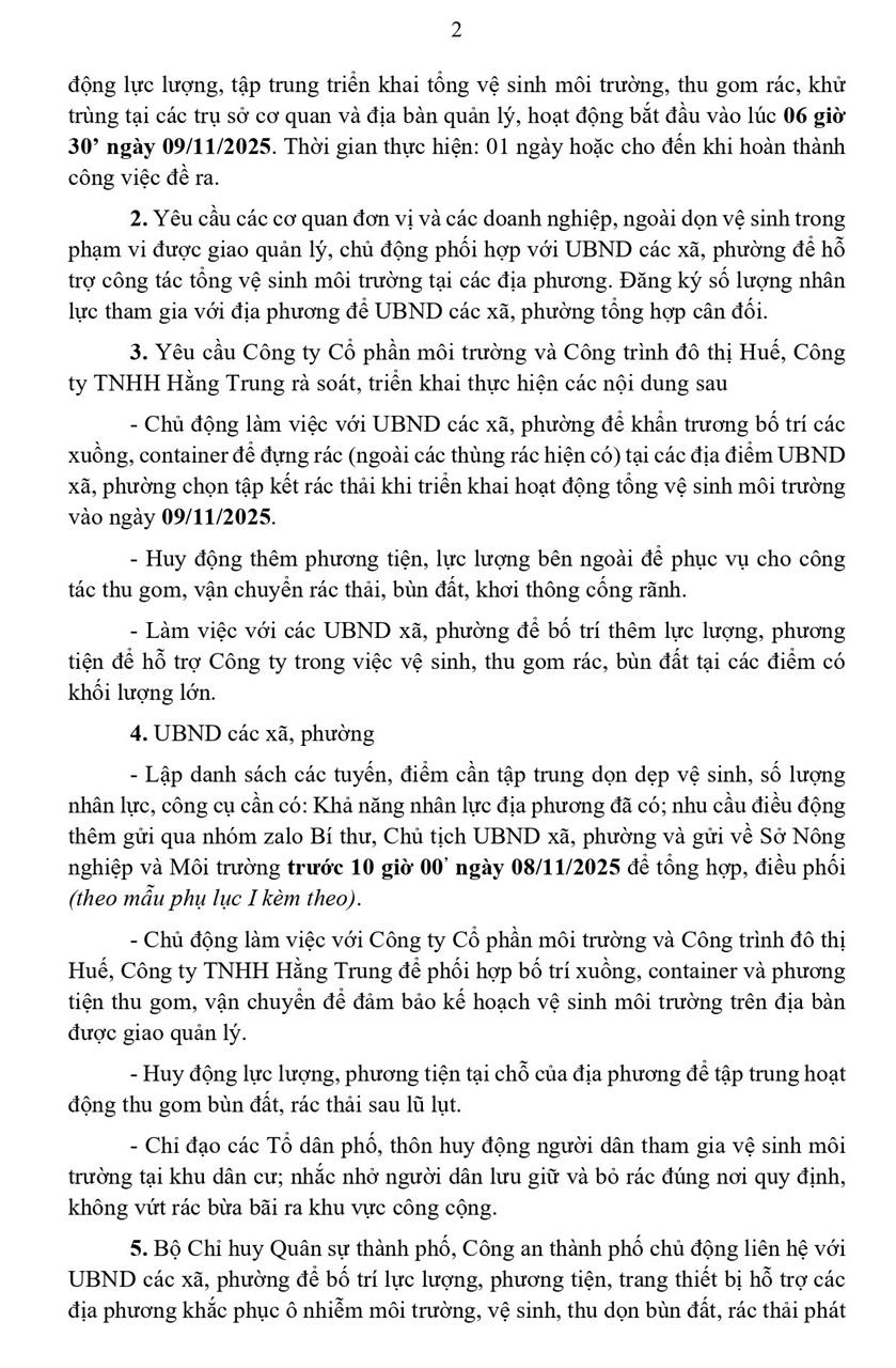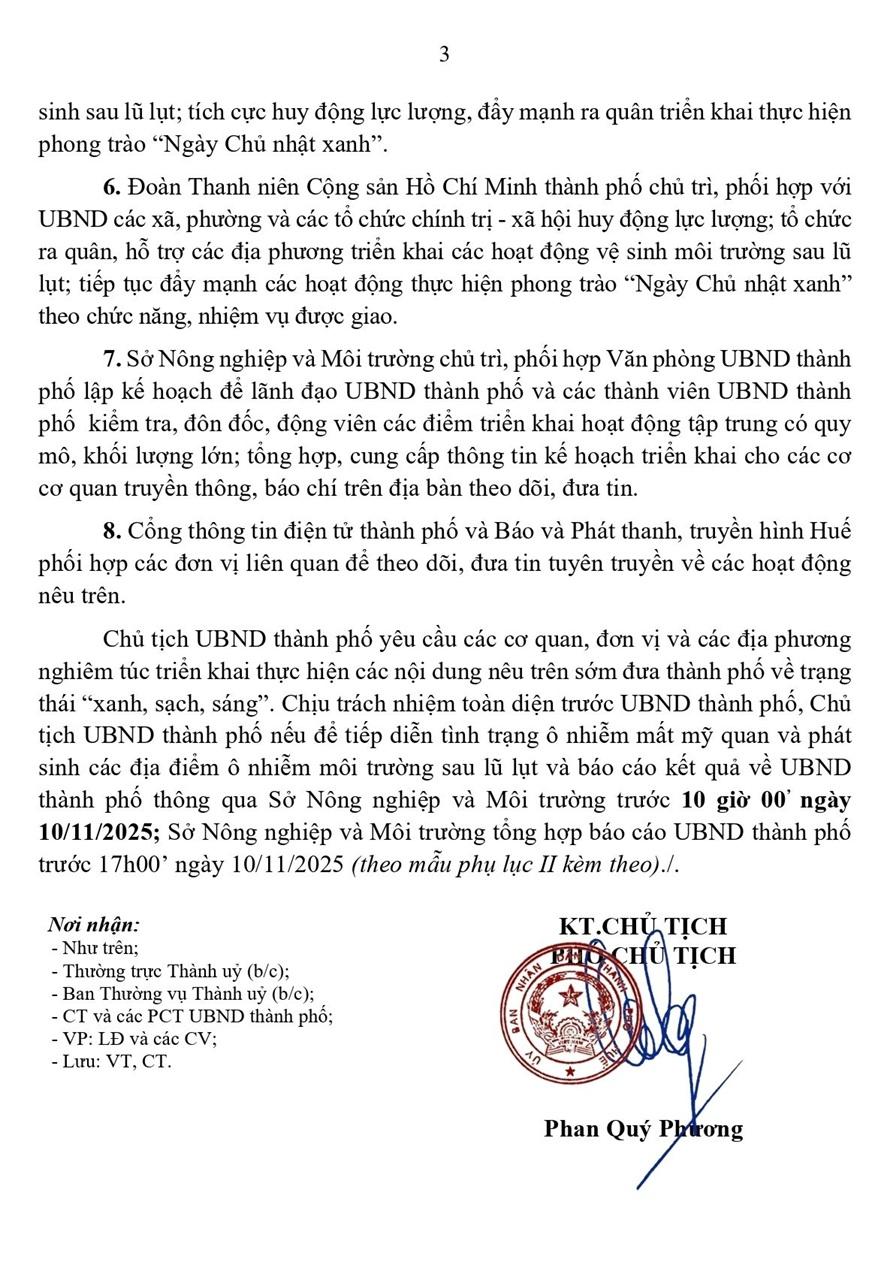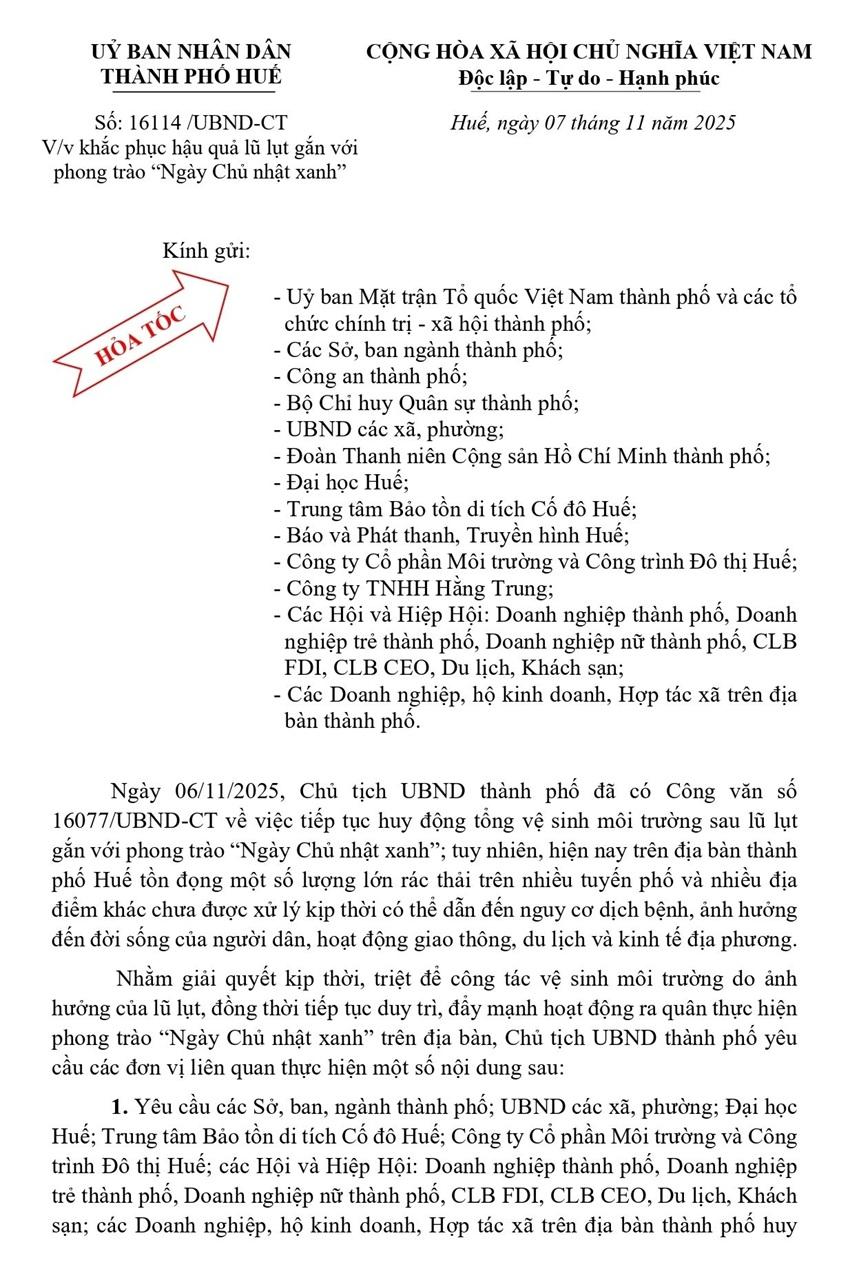 Thực hiện văn bản số 16114/UBND-CT ngày 7/11/2025 về việc khẩn trương khắc phục hậu quả lũ lụt gắn với phong trào "Ngày Chủ nhật xanh". UBND thành phố kêu gọi các cơ quan, đoàn thể, doanh nghiệp, trường học, lực lượng thanh niên và toàn thể cộng đồng cùng ra quân tổng vệ sinh môi trường, thu gom rác thải tại khu dân cư, tuyến đường, khu công cộng, bờ sông và các điểm chịu ảnh hưởng nặng của lũ. Các lực lượng chức năng, đơn vị môi trường sẽ phối hợp hỗ trợ phương tiện, trang thiết bị thu gom, vận chuyển, xử lý kịp thời nhằm tránh phát sinh ô nhiễm, dịch bệnh.