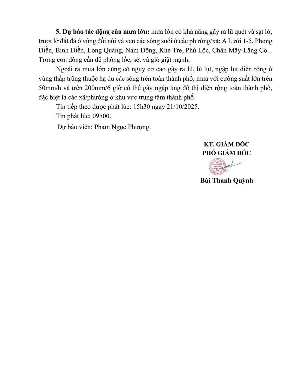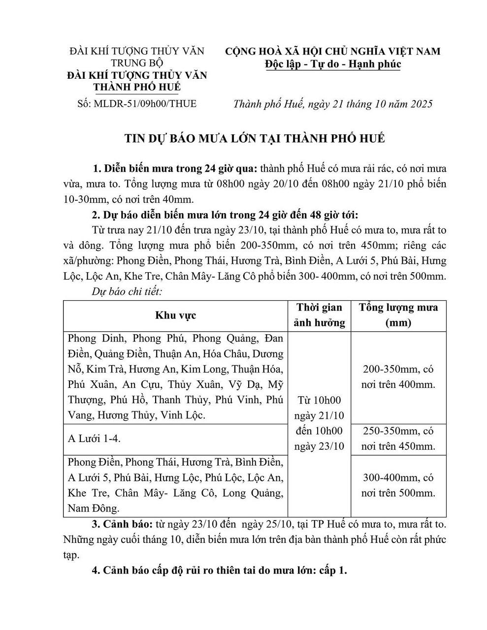 Theo thông tin từ Đài Khí tượng Thủy văn Thành phố Huế, bắt đầu từ trưa ngày 21/10 đến trưa ngày 23/10/2025, trên địa bàn thành phố Huế và các khu vực lân cận sẽ có mưa to đến rất to, có nơi đặc biệt to. Tổng lượng mưa dự báo phổ biến từ 200–350mm, một số nơi có thể vượt 400–500mm, đặc biệt tại khu vực miền núi và vùng trũng thấp.