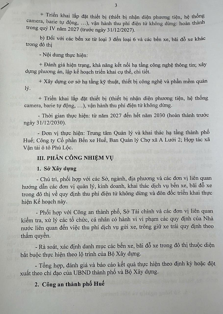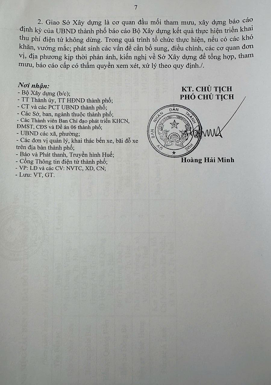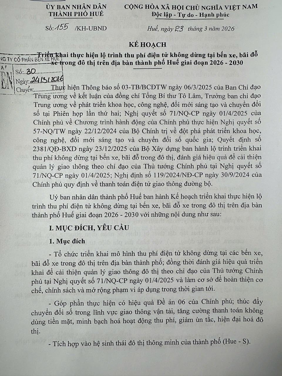 Ngày 23/3/2026, Phó Chủ tịch UBND thành phố Huế, ông Hoàng Hải Minh đã ký ban hành Kế hoạch số 155/KH-UBND về triển khai lộ trình thu phí điện tử không dừng tại các bến xe, bãi đỗ xe trong đô thị trên địa bàn thành phố giai đoạn 2026–2030, đánh dấu bước tiến vào hành trình hiện đại hóa hạ tầng giao thông đô thị tại Thành phố Huế.