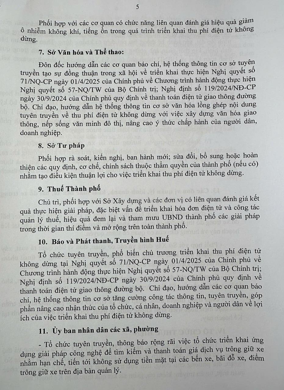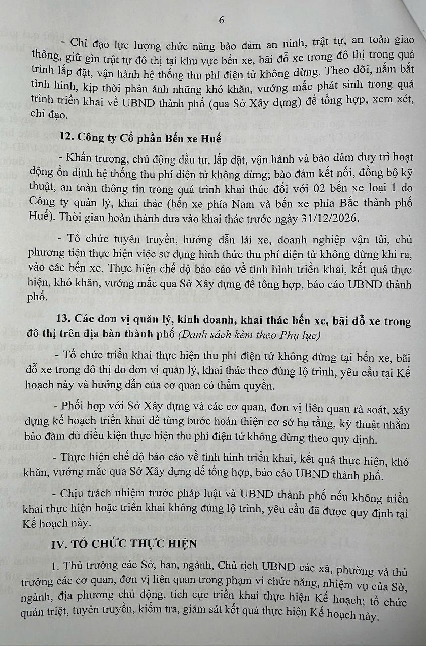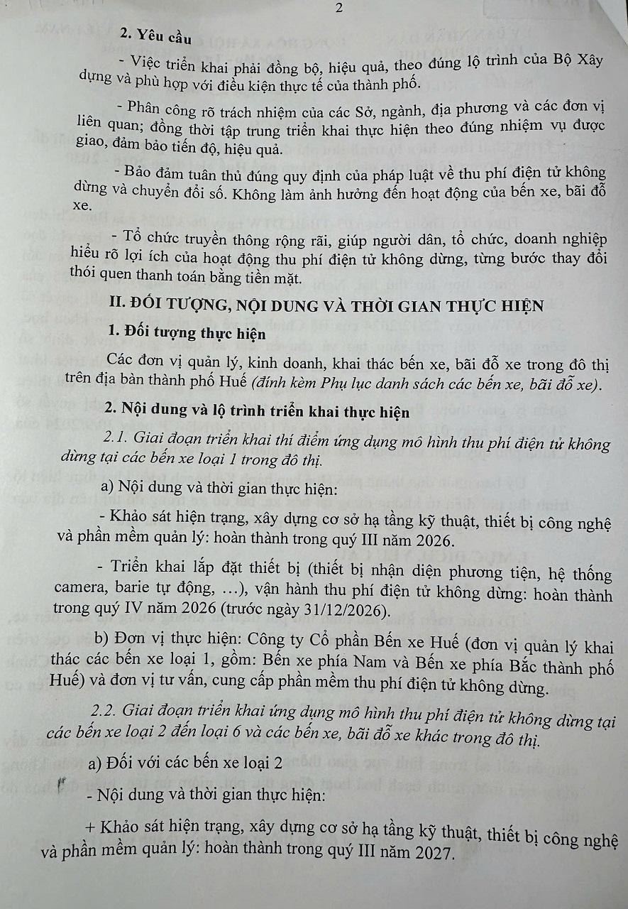 Ngày 23/3/2026, Phó Chủ tịch UBND thành phố Huế, ông Hoàng Hải Minh đã ký ban hành Kế hoạch số 155/KH-UBND về triển khai lộ trình thu phí điện tử không dừng tại các bến xe, bãi đỗ xe trong đô thị trên địa bàn thành phố giai đoạn 2026–2030, đánh dấu bước tiến vào hành trình hiện đại hóa hạ tầng giao thông đô thị tại Thành phố Huế.