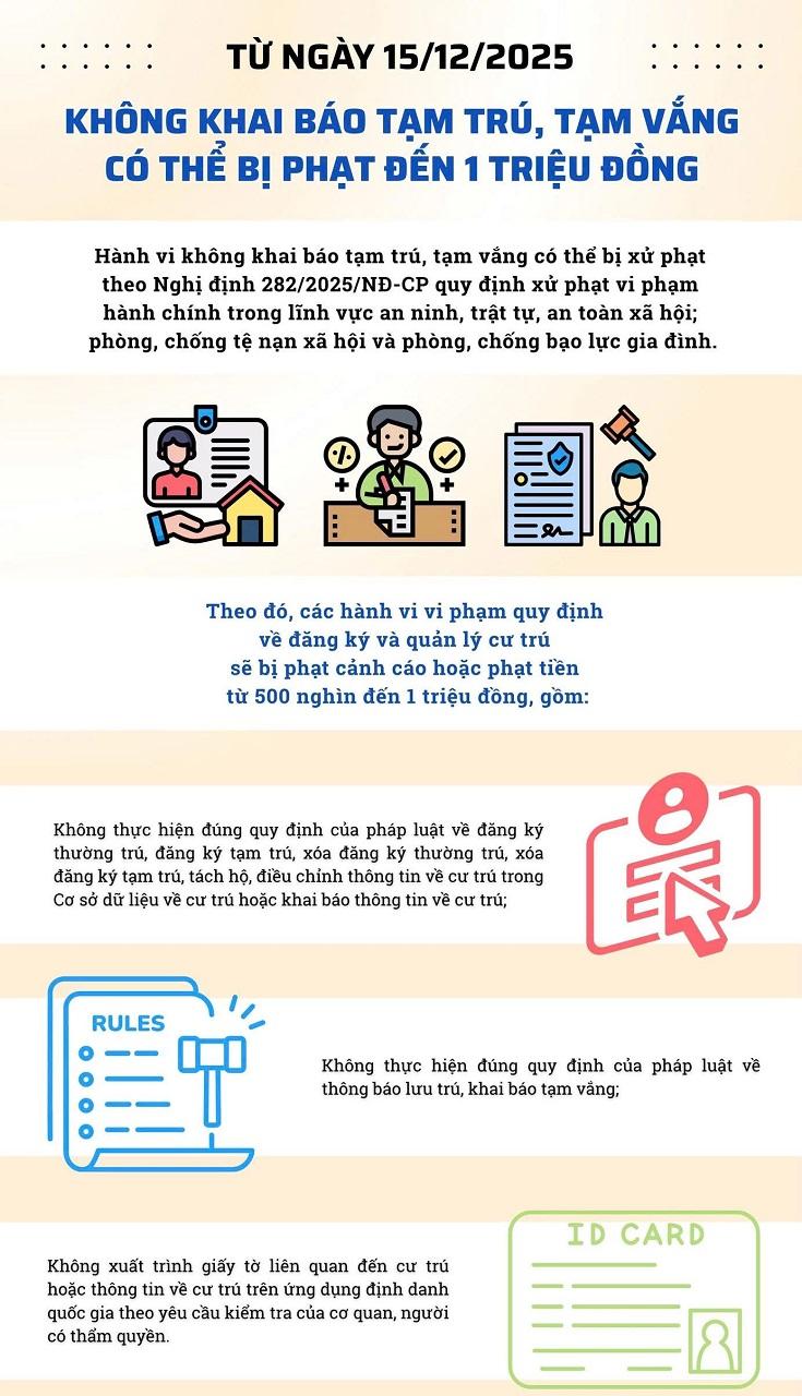 Theo đó, đáng chú ý các hành vi vi phạm quy định về đăng ký và quản lý cư trú sẽ bị phạt cảnh cáo hoặc phạt tiền từ 500 nghìn đến 1 triệu đồng.
