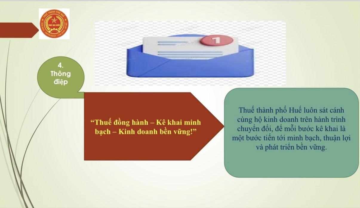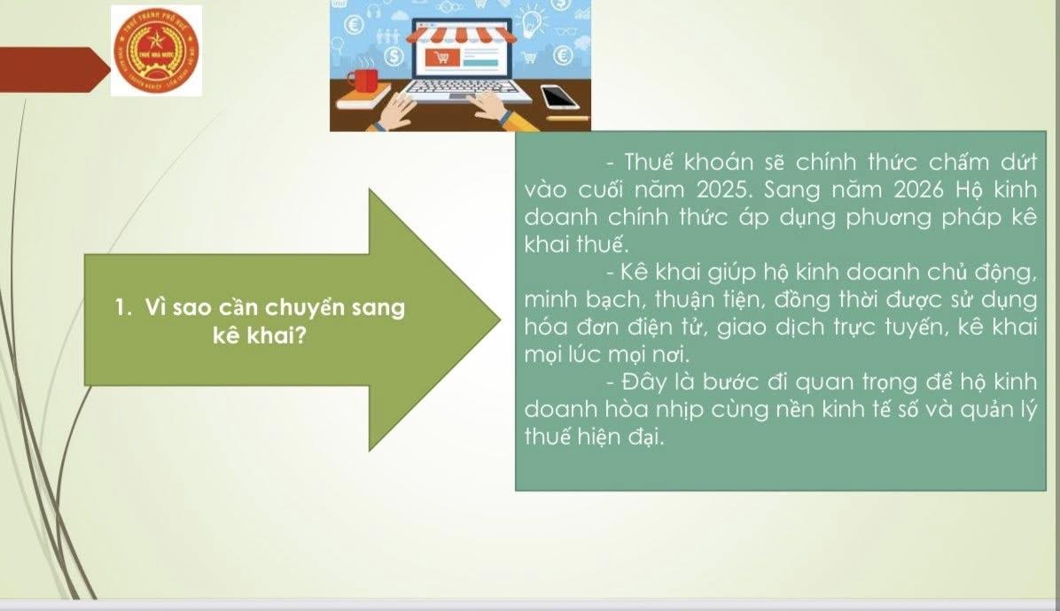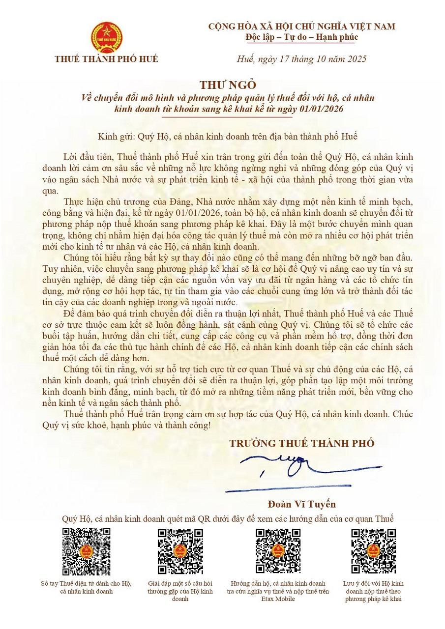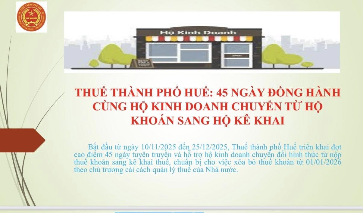 Thực hiện chủ trương của Đảng và Nhà nước về hiện đại hóa công tác quản lý thuế, hướng đến môi trường kinh doanh công bằng, minh bạch và hiệu quả, từ ngày hôm nay 10/11/2025 đến ngày 25/12/2025, Thuế thành phố Huế triển khai chương trình 45 ngày đồng hành cùng hộ kinh doanh chuyển đổi hình thức nộp thuế từ khoán sang kê khai. Từ ngày 01/01/2026, phương pháp nộp thuế khoán sẽ chính thức chấm dứt, toàn bộ hộ, cá nhân kinh doanh trên địa bàn sẽ thực hiện kê khai thuế theo quy định.