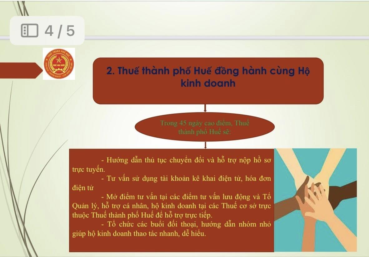 Trong thời gian cao điểm, Thuế thành phố Huế tổ chức hướng dẫn trực tiếp và trực tuyến về thủ tục chuyển đổi, sử dụng tài khoản kê khai điện tử và hóa đơn điện tử; mở điểm tư vấn tại các tổ quản lý thuế, các điểm tư vấn lưu động; tổ chức đối thoại, giải đáp vướng mắc theo từng nhóm hộ để đảm bảo mỗi hộ kinh doanh đều nắm rõ và thực hiện được một cách thuận lợi.