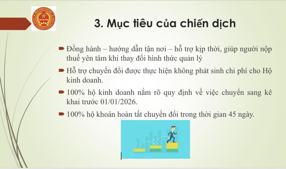 Mục tiêu của đợt triển khai là đảm bảo tất cả hộ kinh doanh hiểu đầy đủ quy định, yên tâm khi chuyển đổi và hoàn thành việc chuyển sang kê khai trước ngày 01/01/2026. Việc hỗ trợ được thực hiện miễn phí, không phát sinh chi phí cho hộ kinh doanh. Quý bạn đọc, đối tác vận tải, mặt bằng kinh doanh khác tại Công ty CP Bến xe Huế quan tâm có thể download chi tiết Quyết định 3389/QĐ-BTC ngày 06/10/2025 tại đây.